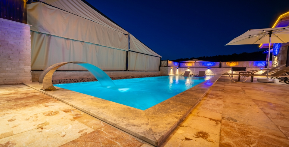 Villanın dış alanı mahremiyet odaklı olarak tasarlanmış. Korunaklı havuzu sayesinde misafirler rahatça güneşlenip yüzmenin tadını çıkarabilir. 12 metre uzunluğundaki havuzun yanında sığ bölüm ve çocuklar için güvenli bir alan da bulunuyor. Ayrıca bahçede salıncak ve langırt gibi eğlenceli detaylar da yer alıyor.