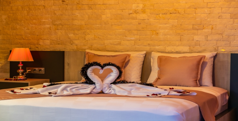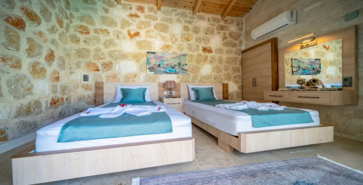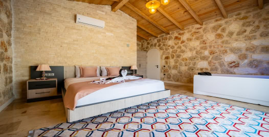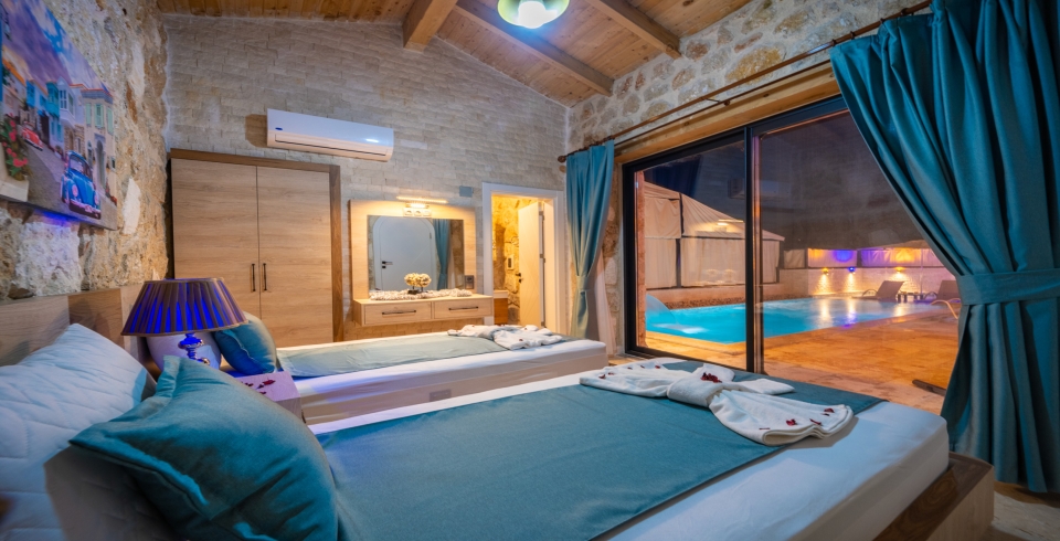 İki yatak odasından oluşan villanın birinci yatak odasında iki tek kişilik yatak, klima ve banyo mevcut. Ana yatak odasında ise çift kişilik yatak, klima, televizyon ve geniş bir jakuzi bulunuyor. Bu oda, balayı çiftlerine özel bir konfor alanı sunarken, tatilinize romantik bir dokunuş katıyor.