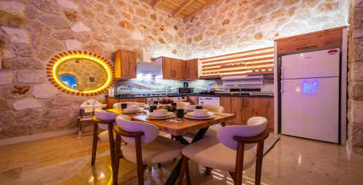 Villanın iç mekanında modern konfor unsurları ön planda tutulmuş. Ferah salonda rahat oturma grubu, klima ve televizyon yer alıyor. Tam donanımlı açık mutfakta ise tatil boyunca ihtiyaç duyulabilecek tüm araç gereçler bulunuyor. Şık yemek alanı, hem aile yemekleri hem de romantik akşamlar için ideal bir atmosfer yaratıyor.
