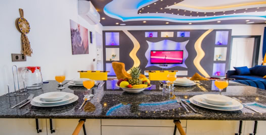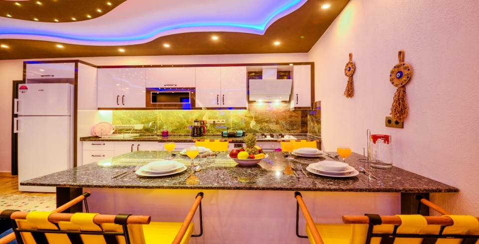 Mutfak : Yemek masası, buzdolabı, çamaşır makinesi, fırın, 4’lü ocak, elektrikli su ısıtıcısı, çatal-bıçak takımı, tencere-tava takımı, bulaşık makinesi bulunmaktadır.
