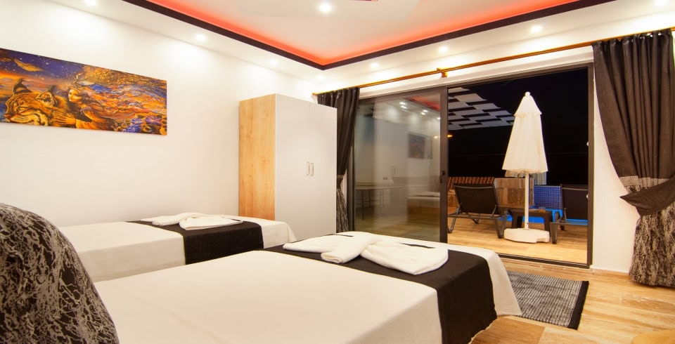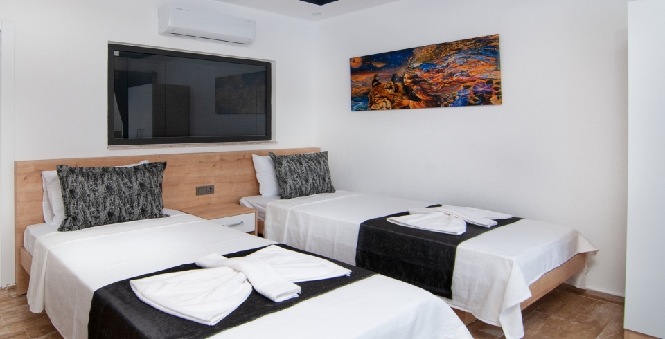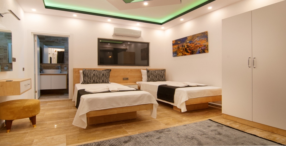 2. Yatak Odası : 2 adet tek kişilik yatak, komodin, klima, makyaj masası, banyo ve lavabo bulunmaktadır.