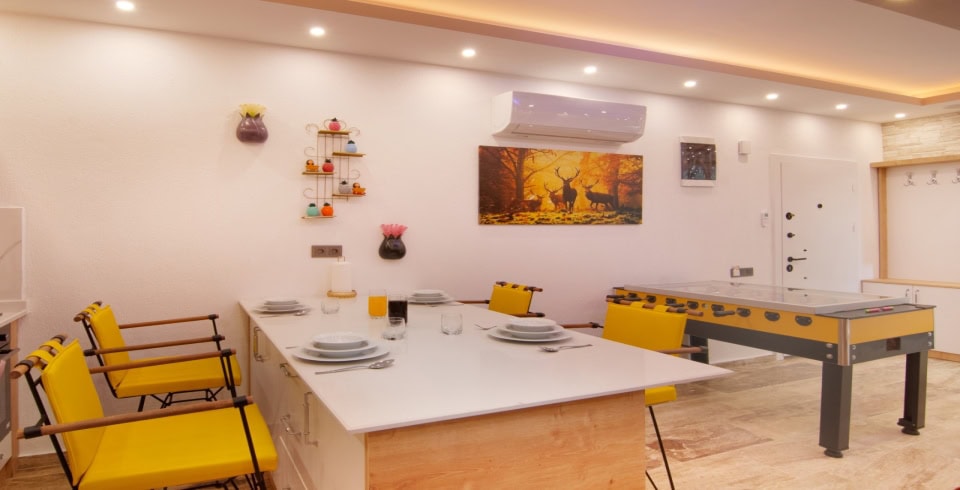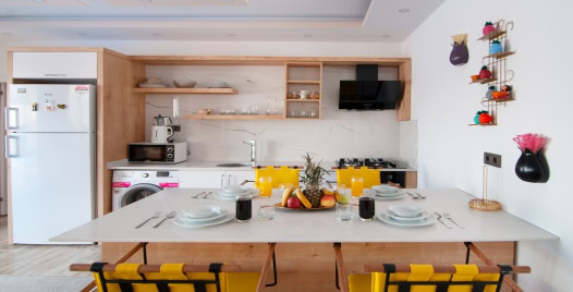 Mutfak : Yemek masası, buzdolabı, çamaşır makinesi, fırın, 4’lü ocak, elektrikli su ısıtıcısı, çatal-bıçak takımı, tencere-tava takımı, bulaşık makinesi bulunmaktadır.