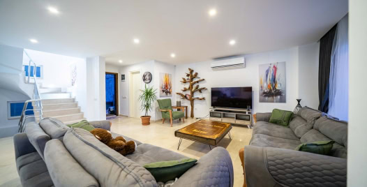 Salon: Konforlu oturma grubu, LCD TV, klima ve wi-fi modem, uydu sistemi mevcuttur. Havuz terasına çıkış bulunmaktadır.