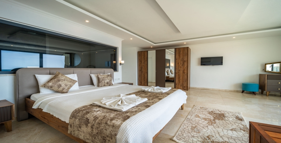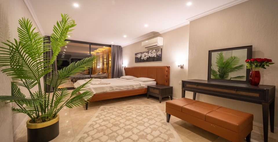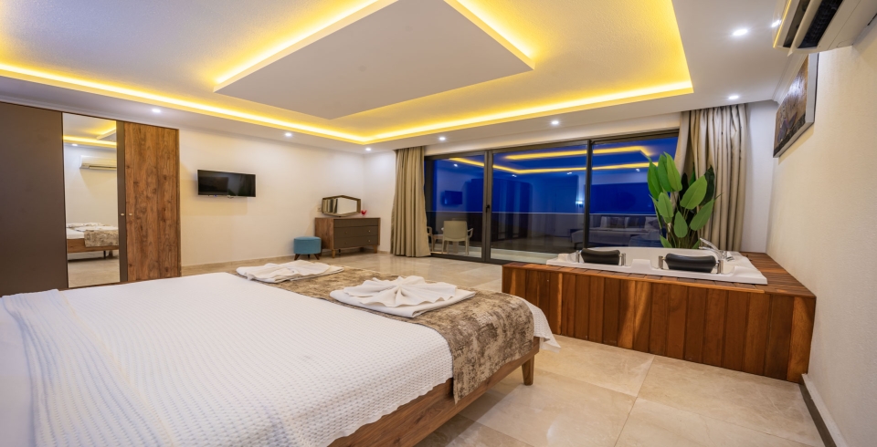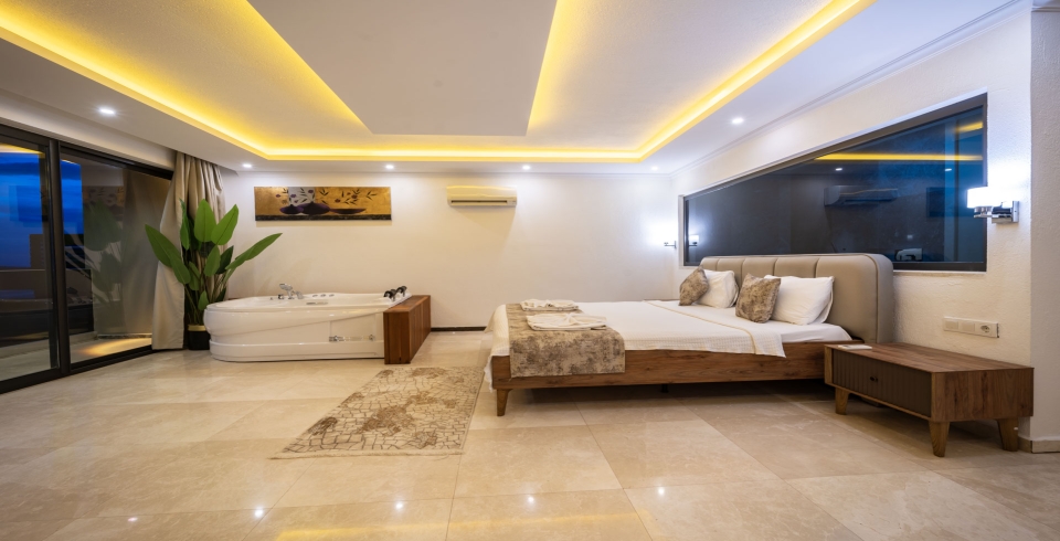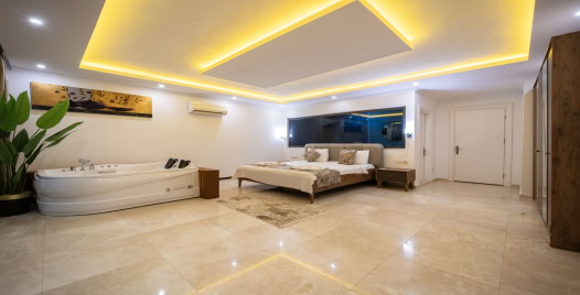 1. Yatak Odası : 1 adet çift kişilik yatak, klima, komodin, makyaj masası, elbise dolabı, jakuzi, banyo ve lavabo bulunmaktadır.