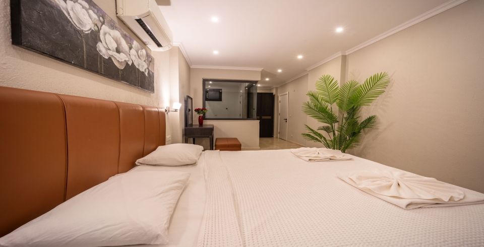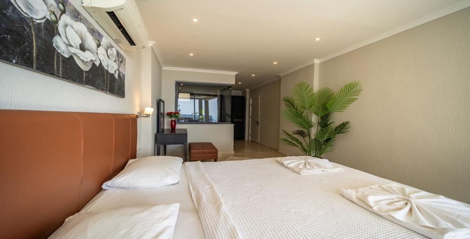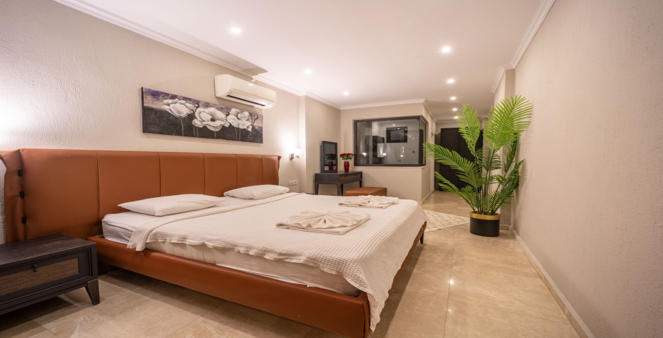 2. Yatak Odası : 1 adet çift kişilik yatak, klima, komodin, makyaj masası, elbise dolabı, banyo ve lavabo bulunmaktadır.
