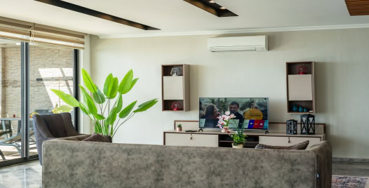 Salon : Oturma grubu, Uydu TV (LCD), Klima, 6 kişilik yemek masası, Havuz terasına çıkış bulunmaktadır.