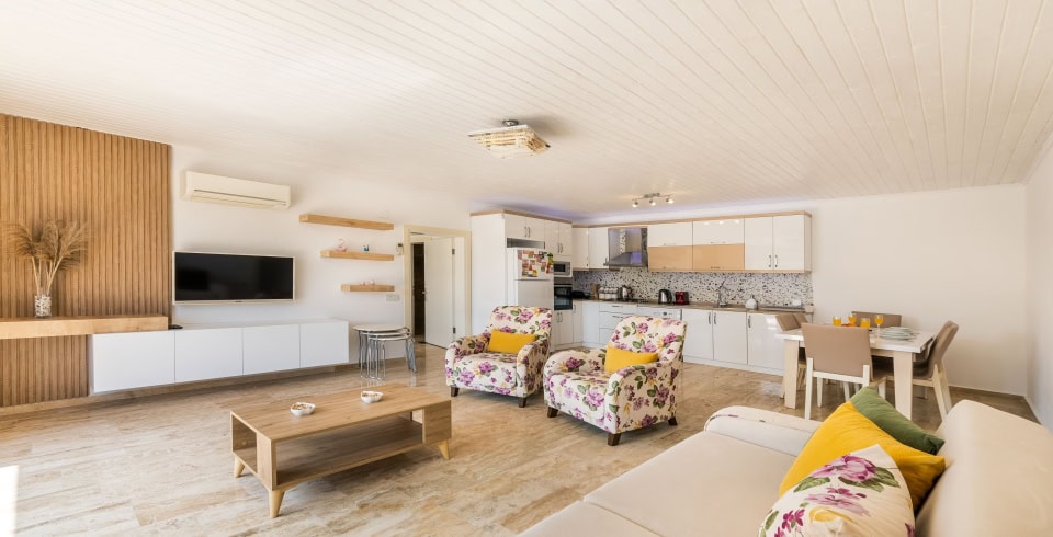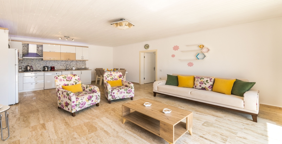 Salon: LCD TV, modern oturma grubu , yemek masası ve sandalyeler , kablosuz modem bulunmaktadır.