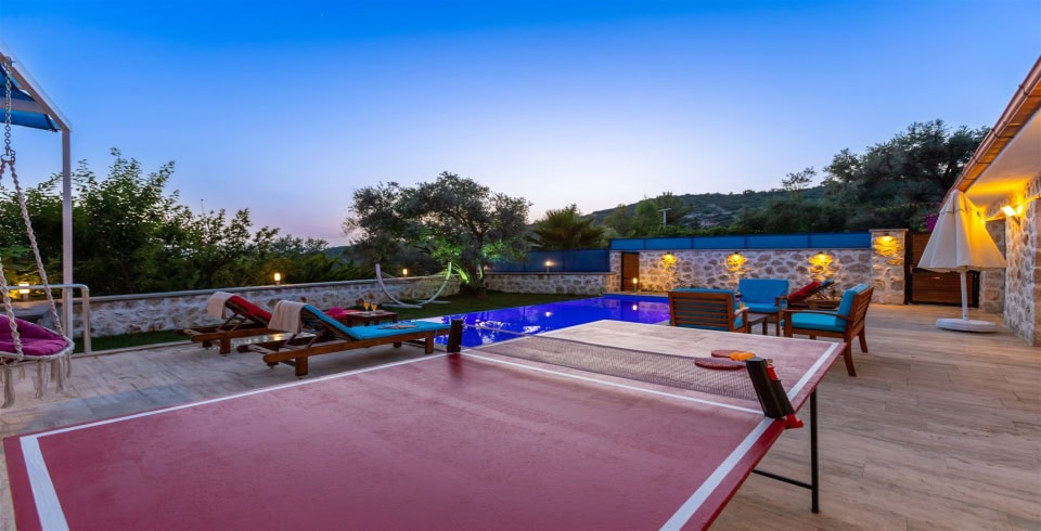 Havuz ve Bahçe: Şezlong, güneşlenme şemsiyesi , salıncak , langırt , masa tenisi , hamak, barbekü , yemek masası ve sandalyeleri bulunmaktadır.