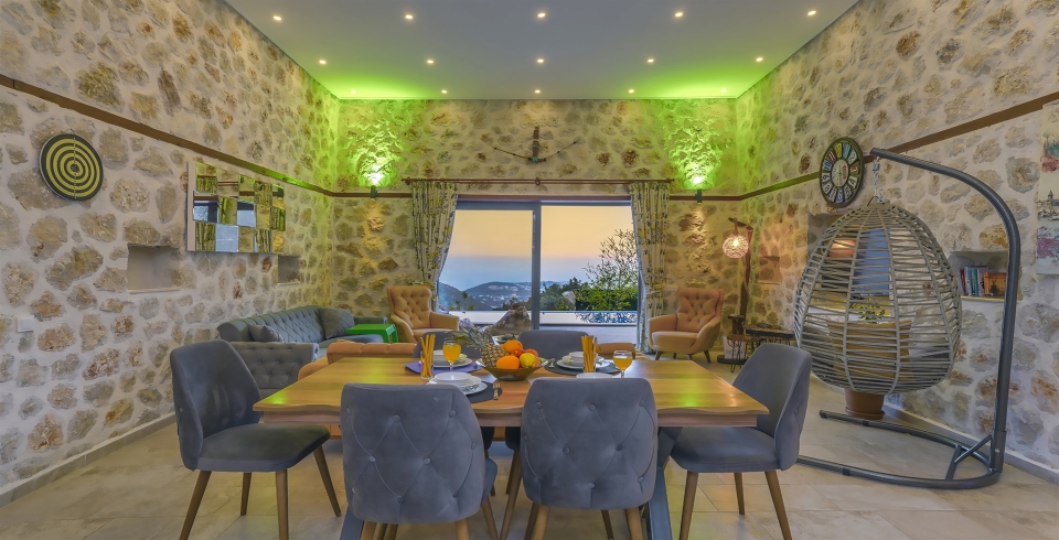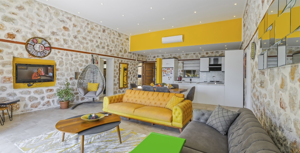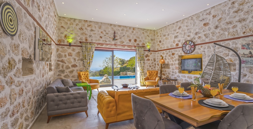 Salon : Villa salonunda konforlu oturma grubu, klima, TV, internet, uydu alıcı, yemek masası, sehpa bulunmaktadır.