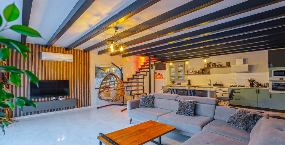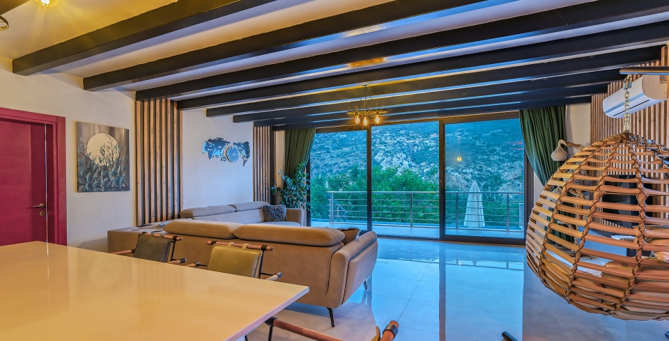 Salon : Villa salonunda konforlu oturma grubu, klima, TV, internet, uydu alıcı, yemek masası, sehpa bulunmaktadır.