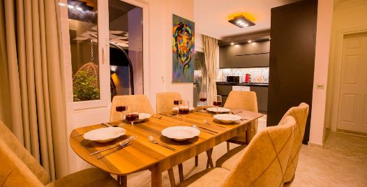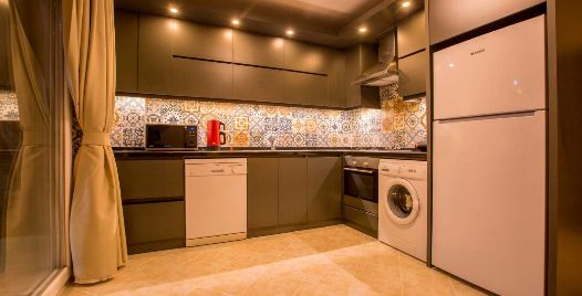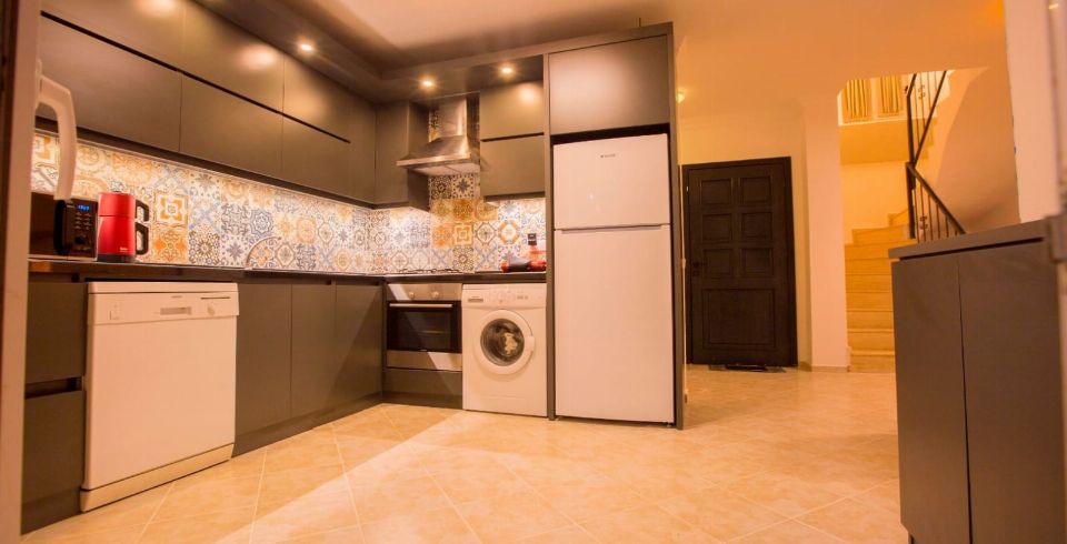 Mutfak : Villamızın geniş Amerikan mutfağı ile sizlere kendi evinizin mutfağı gibi hissettirecek. Ayrıca mutfakta klima, bulaşık makinası, buzdolabı, çamaşır makinası, mikrodalga fırın, tost makinası, su ısıtıcısı, fırın, 4`lü ocak seti ve kişilik geniş yemek masası ile tava tencere vb. mutfak araç gereçlerini kullanma fırsatını sizlere sunuyoruz.