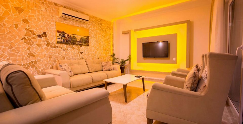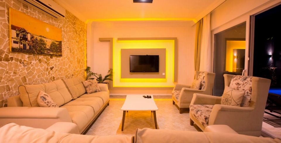 Salon : Salonunda sizi şık bir oturma grubu ile klima, televizyon, internet, uydu, koltuk, sehpa ile ferah bir salon bekliyor olacaktır. Havuz terasına çıkış yapılmaktadır.
