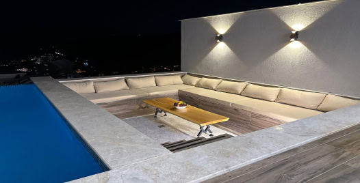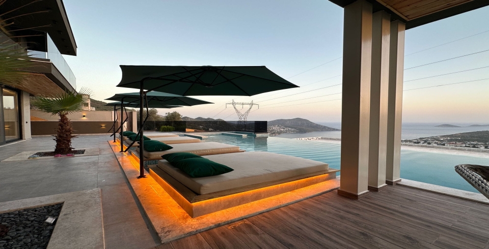 Havuz ve Bahçe: Deniz manzaralı özel yüzme havuzu, şezlong, güneş şemsiyesi, bahçe yemek masası, salıncak, bahçe oturma gruba bulunmaktadır.