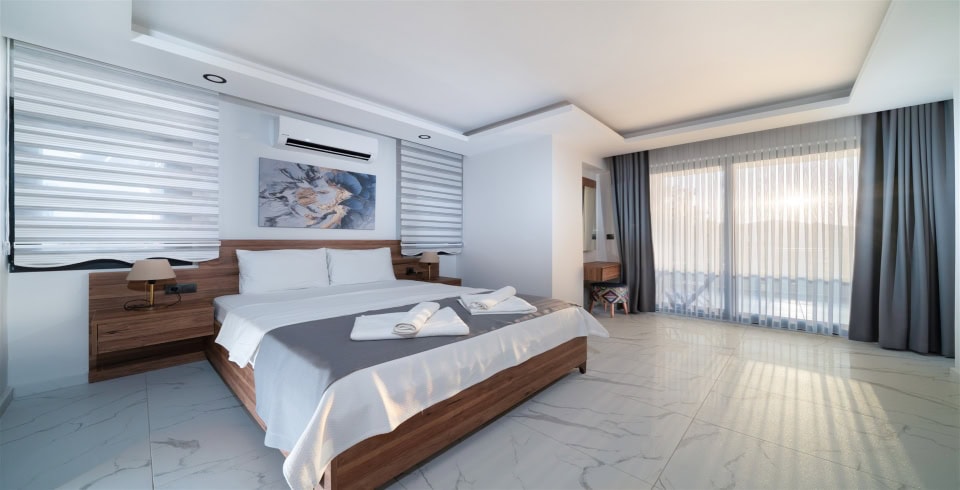 1.Yatak Odası: Çift kişilik yatak, Komodin, Klima, Elbise dolabı, Şifonyer, Banyo ve tuvalet bulunmaktadır.