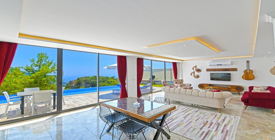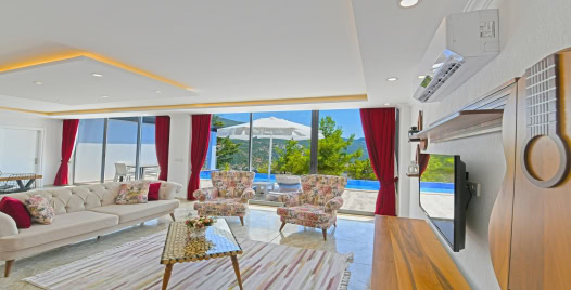 Salon: Villa salonunda konforlu oturma grubu, klima, TV, internet, uydu alıcı, yemek masası, sehpa bulunmaktadır.