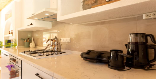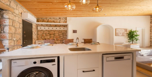 Mutfak: Villamızın mutfağında buzdolabı bulaşık makinası, çamaşır makinası, 4'lü ocak, mikrodalga fırın, kahve makinası,elektrikli su ısıtıcısı,yemek takımı ve mutfak araç gereçleri bulunmaktadır.