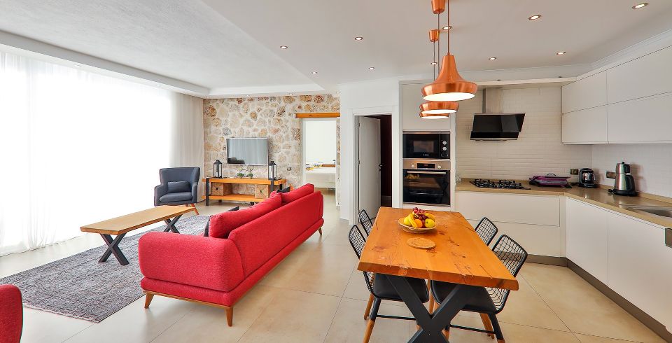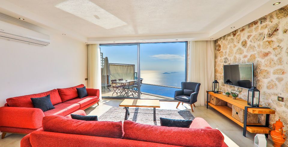 Salon : Villamız deniz manzaralı salonunda, oturma grubu, klima, ütü, ütü masası, TV, DVD, yemek masası, WİFİ havuz basına çıkış bulunmaktadır.