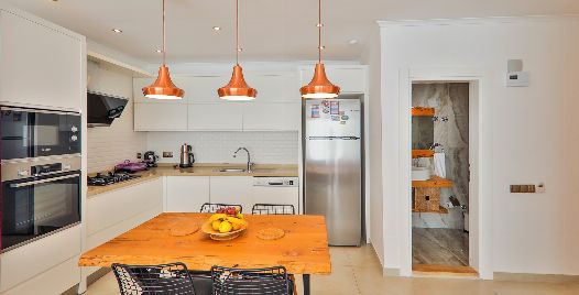 Mutfak : Amerikan mutfakta buzdolabı, çamaşır makinası, bulaşık makinası,4lü ocak, fırın, kettle, ekmek kızartma makinası, 2 kişilik yemek takımı, çatal bıçak takımı ve havuz başına çıkış bulunmaktadır.