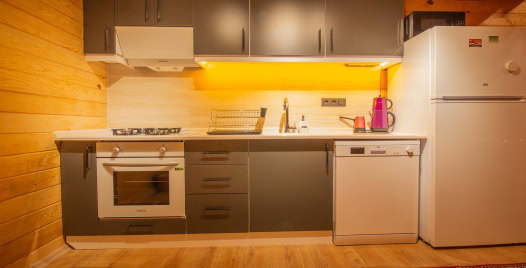 Mutfak: Açık planlı mutfak,2 kişiye yetecek kadar mutfak malzemeleri, buzdolabı, fırın, ocak, mikrodalga fırın, bulaşık makinesi, çamaşır makinesi, tost makinesi, kettle ve çaydanlık bulunmaktadır..