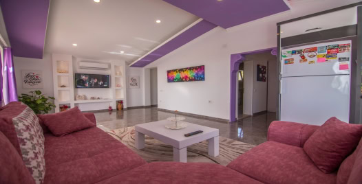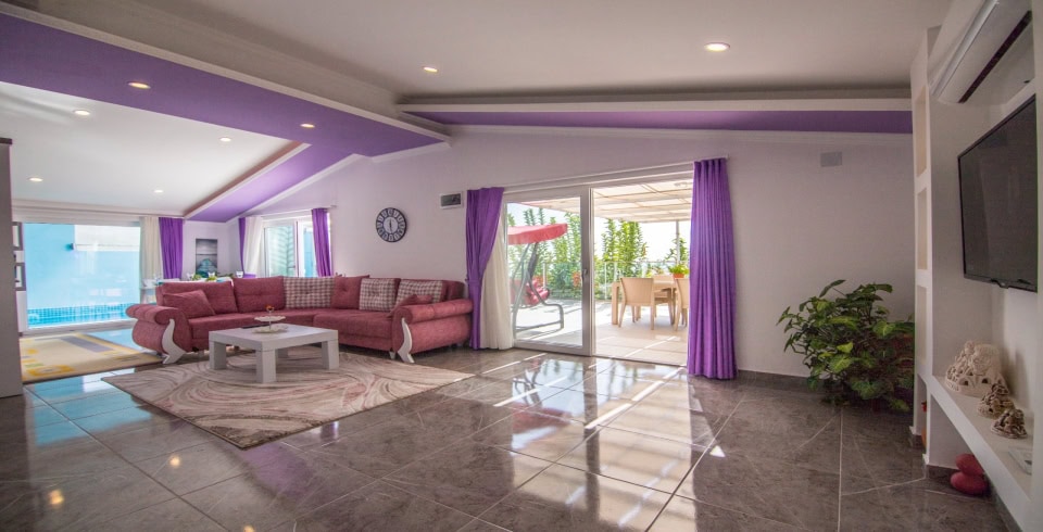 Salon : Salon içerisinde oturma grubu, TV, klima ve sehpa bulunmaktadır. Havuz terasına çıkış yapılabilmektedir.