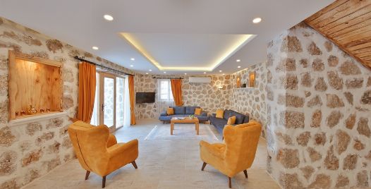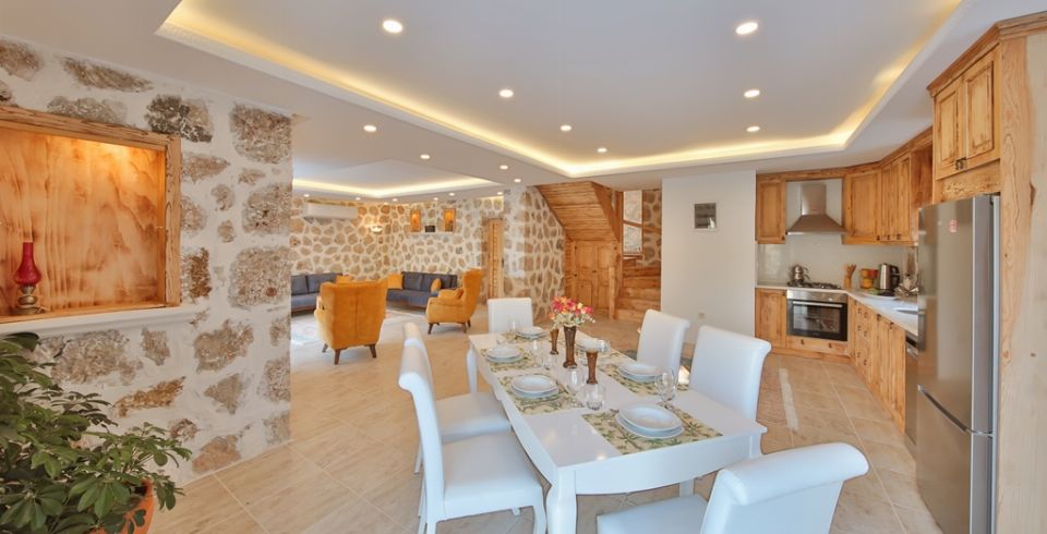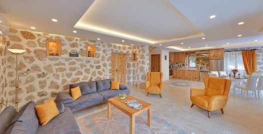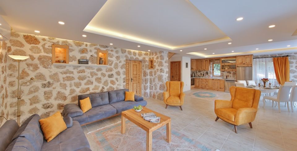 Salon : Villa Aslan salonunda konforlu oturma grubu, klima TV, internet, uydu alıcı, yemek masası, sehpa bulunmaktadır.