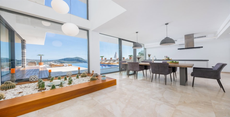 Havuz ve Bahçe: Oturma grubu , barbekü, şezlong, güneş şemsiyesi, yemek masası bulunmaktadır. Villamızın havuzundan sonsuzluk deniz manzarası görülmektedir.