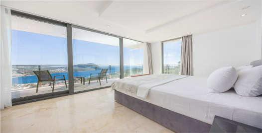 4. Yatak Odası : 1 Adet çift kişilik yatak, komodin, gardırop, makyaj masası, klima, tuvalet ve banyo bulunmaktadır. Odamızdan deniz manzarası görülmektedir.
