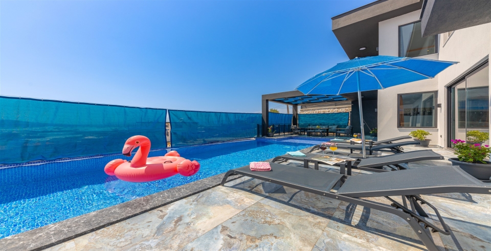 Havuz ve Bahçe : Villamızın havuz terasında şezlong, şemsiye, oturma grubu, yemek masası, barbekü ve özel yüzme havuzu bulunmaktadır.