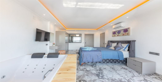 1. Yatak Odası : 1 adet çift kişilik yatak, klima, komodin, makyaj masası, elbise dolabı, jakuzi, banyo ve lavabo bulunmaktadır.