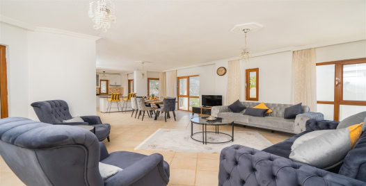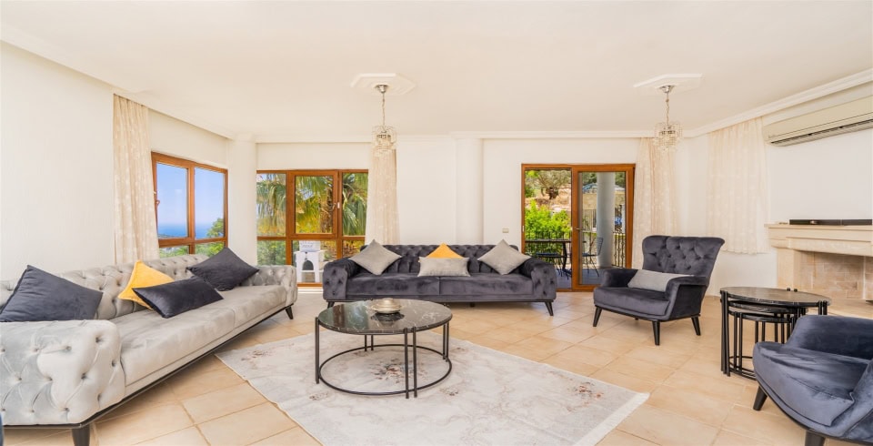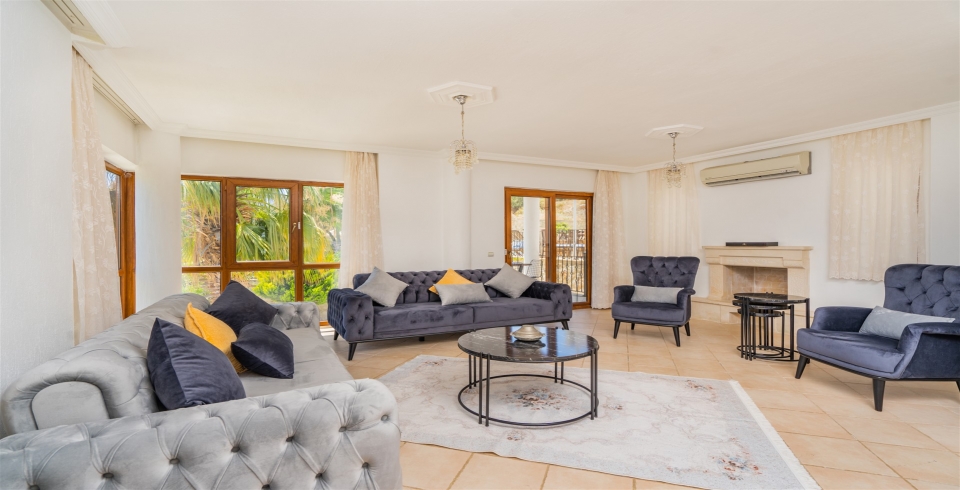 Salon : Villamızın salonunda oturma grubu, sehpa, TV, uydu alıcısı, internet, klima bulunmakta olup salonumuzdan havuz başına çıkış vardır.