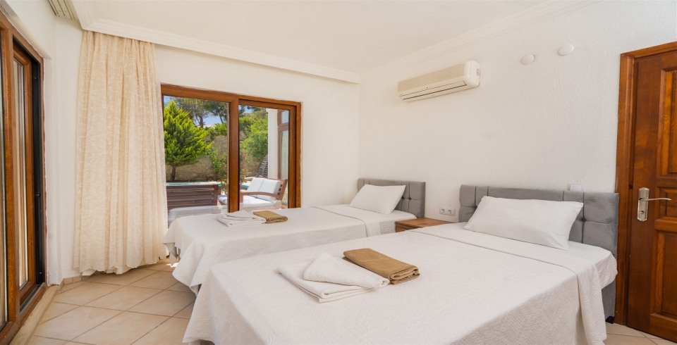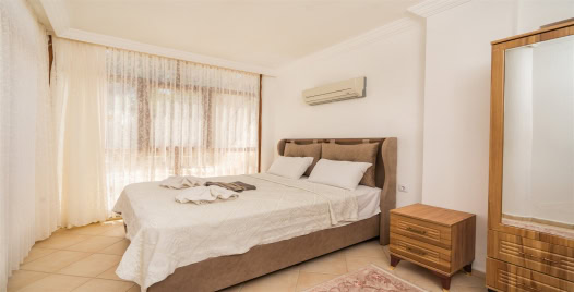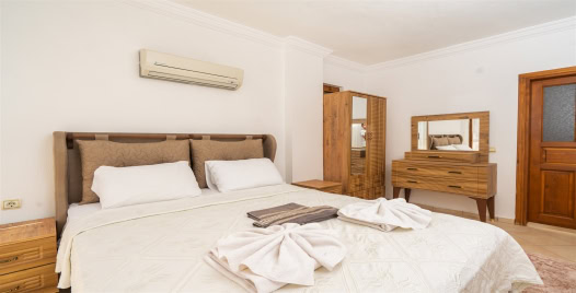 1. Yatak Odası : Çift kişilik yatak, klima, elbise dolabı, makyaj masası, komodin banyo & WC ortak kullanımdır. Yatak Odasından havuz başına çıkış vardır.