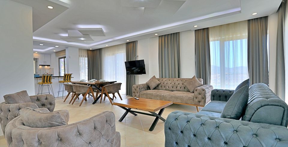 Salon : Villamızın salonunda oturma grubu, sehpa, TV, uydu alıcısı, internet, klima bulunmakta olup salonumuzdan havuz başına çıkış vardır.