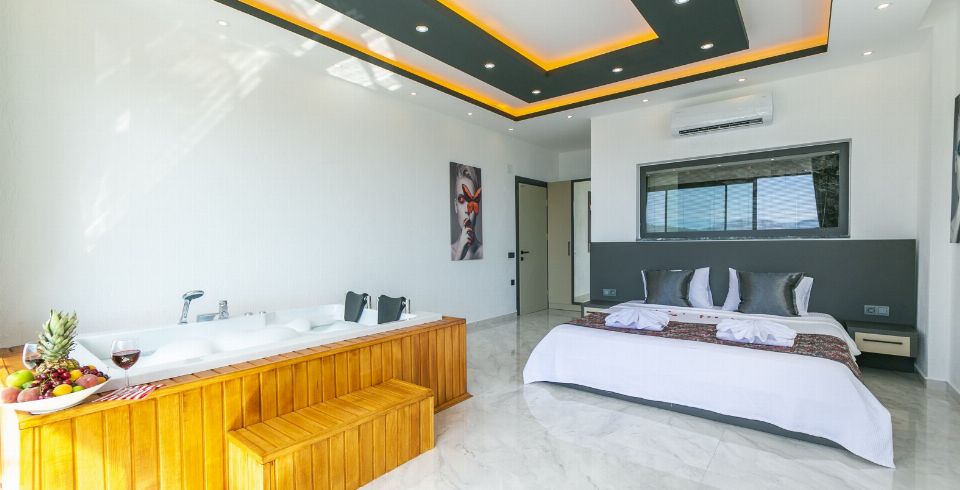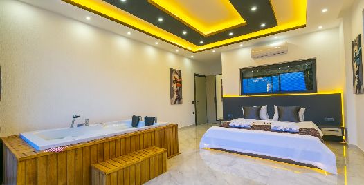 1. Yatak Odası : 1 Adet çift kişilik yatak, komodin, gardırop ebeveyn banyosu, klima, Jakuzi bulunmaktadır.
