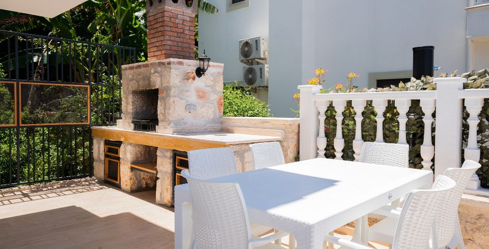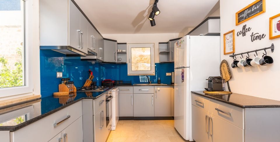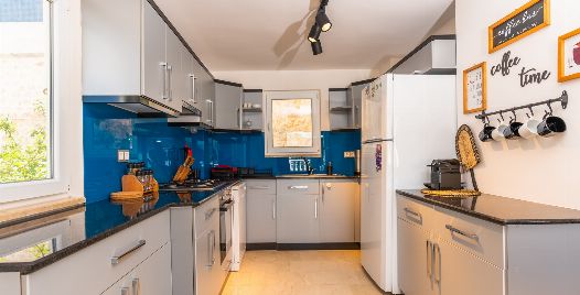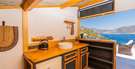 Mutfak : Villa içinde modern Amerikan mutfak bulunmaktadır. Mutfakta mikrodalga fırın, bulaşık makinası, ankastre fırın, buzdolabı, çamaşır makinası, ankastre 4’lü ocak, elektrikli su ısıtıcı kettle, tencere ve tava takımı, 8 kişilik yemek takımı, kaşık ve çatal seti ve bardaklar bulunmaktadır. Havuz başına geçiş bulunmaktadır.