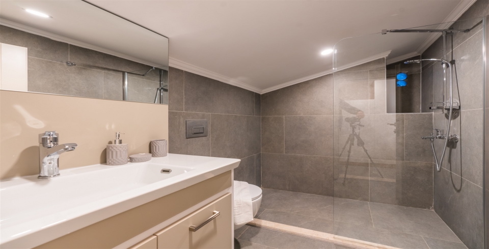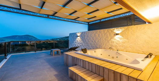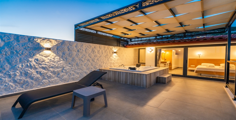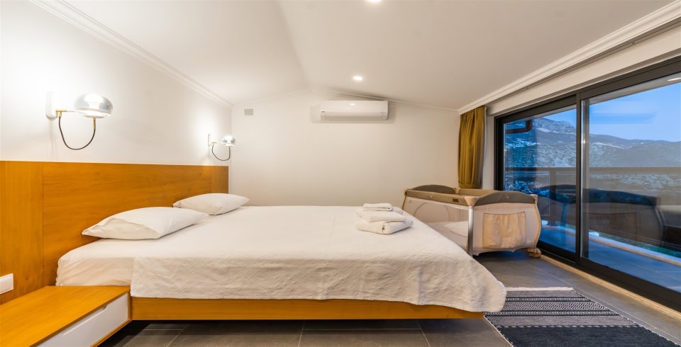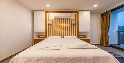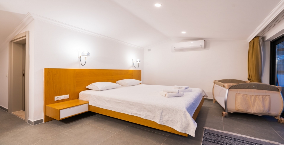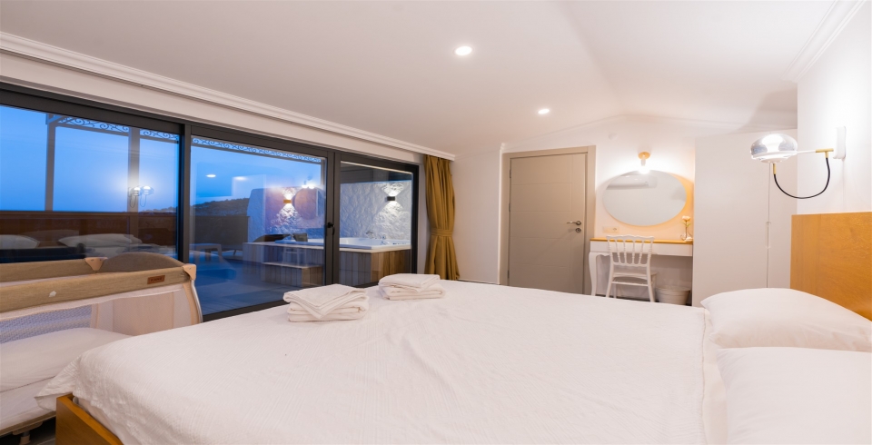 2. Yatak odası: 1 adet çift kişilik yatak, elbise dolabı, komodin, klima, makyaj masası, banyo ve tuvalet bulunmaktadır. Çatı katında jakuzisi mevcuttur.