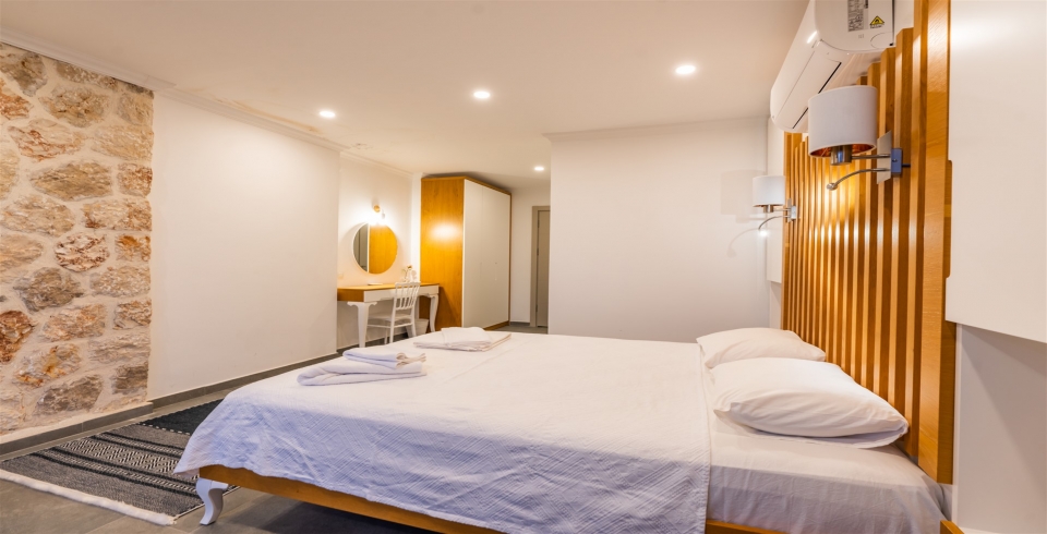 1. Yatak odası: 1 adet çift kişilik yatak, komodin, klima, makyaj masası, elbise dolabı, banyo ve tuvalet bulunmaktadır.