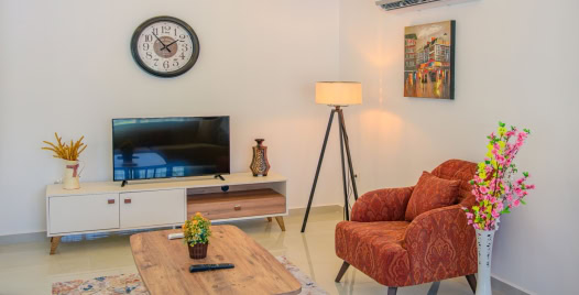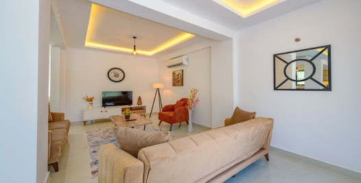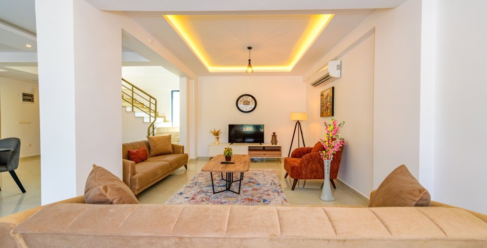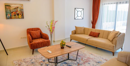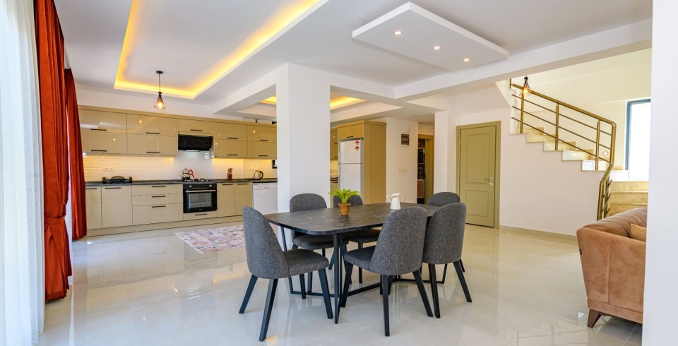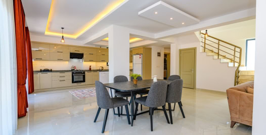 Salon: Özenle döşenmiş salon, modern koltuklar, 8 kişilik yemek masası, LCD TV ve klima bulunmaktadır.