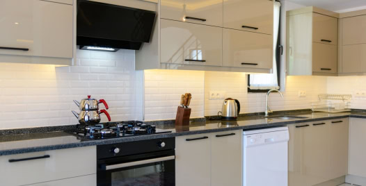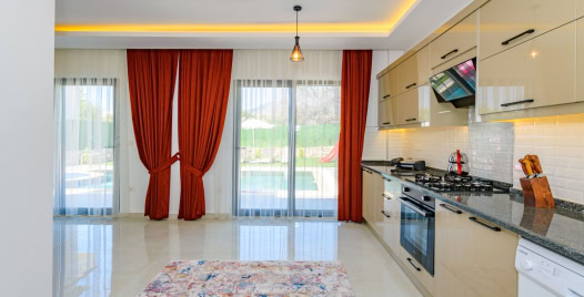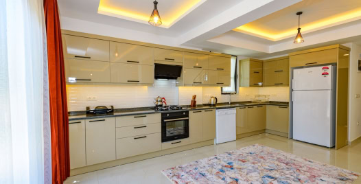 Mutfak: Açık planlı mutfak, 8 kişi ve daha fazla kişiye yetecek kadar mutfak malzemeleri, buzdolabı, fırın, ocak, mikrodalga fırın, bulaşık makinesi, çamaşır makinesi, tost makinesi, kettle ve çaydanlık bulunmaktadır..