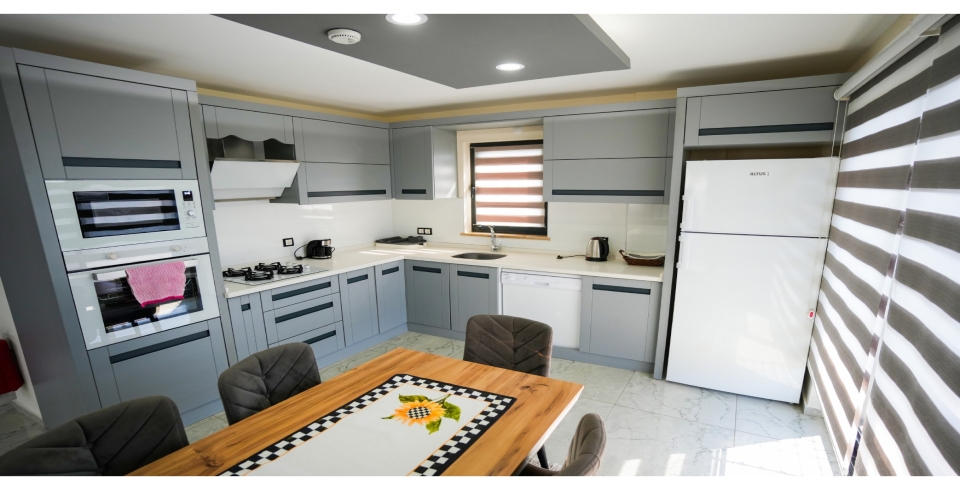 Mutfak: Açık planlı mutfak, 8 kişi ve daha fazla kişiye yetecek kadar mutfak malzemeleri, buzdolabı, fırın, ocak, mikrodalga fırın, bulaşık makinesi, çamaşır makinesi, tost makinesi, kettle ve çaydanlık bulunmaktadır..