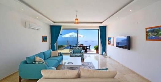 Salon : Sizi şık bir oturma grubu ile klima, televizyon, internet, uydu, koltuk, sehpa ile ferah bir salon bekliyor olacaktır. Havuz terasına çıkış yapılmaktadır.