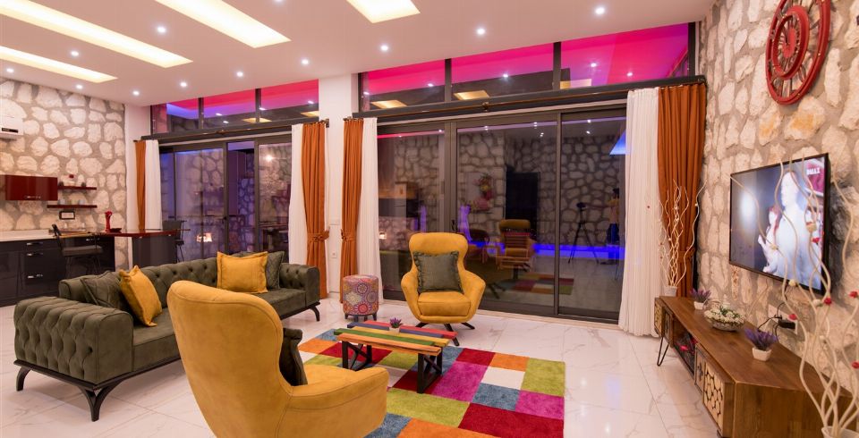 Salon : Villa Gökkuşağının salonunda sizi şık bir oturma grubu ile klima, televizyon, internet, uydu, koltuk, sehpa ile ferah bir salon bekliyor olacaktır. Havuz terasına çıkış yapılmaktadır.