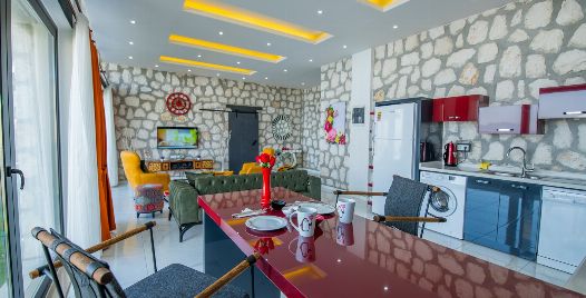 Mutfak : Villamızın geniş Amerikan mutfağı ile sizlere kendi evinizin mutfağı gibi hissettirecek. Ayrıca mutfakta klima, bulaşık makinası, buzdolabı, çamaşır makinası, mikrodalga fırın, tost makinası, ekmek kızartma, su ısıtıcısı, fırın, 4'lü ocak seti ve 2 kişilik yemek masası ile tava tencere vb. mutfak araç gereçlerini kullanma fırsatını sizlere sunuyoruz.