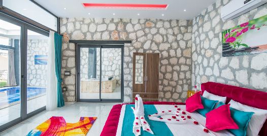 Yatak Odası : 1 adet çift kişilik yatak, kapalı ısıtmalı havuz, televizyon, klima, jakuzi, komodin, elbise dolabı, makyaj masası, banyo ve lavabo bulunmaktadır.