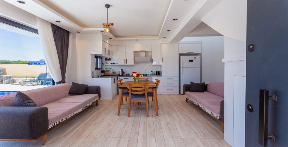 Mutfak : Villamızın içinde modern Amerikan mutfak bulunmaktadır. Mutfakta bulaşık makinası, ankastre fırın, buzdolabı, ankastre 4’lü ocak, elektrikli su ısıtıcı kettle, tencere ve tava takımı, yemek takımı, kaşık ve çatal seti ve bardaklar bulunmaktadır. Havuz başına geçiş bulunmaktadır.