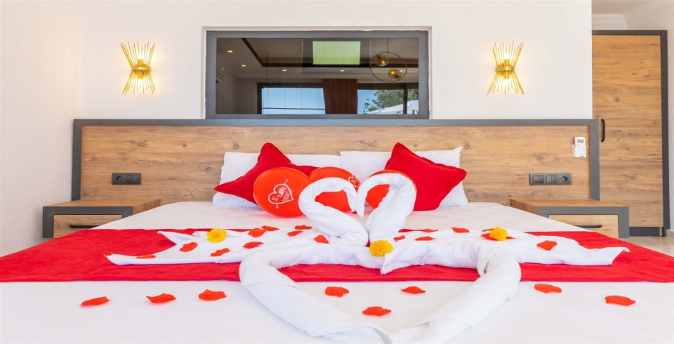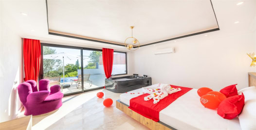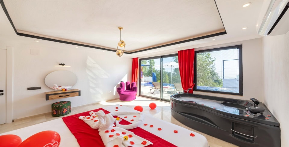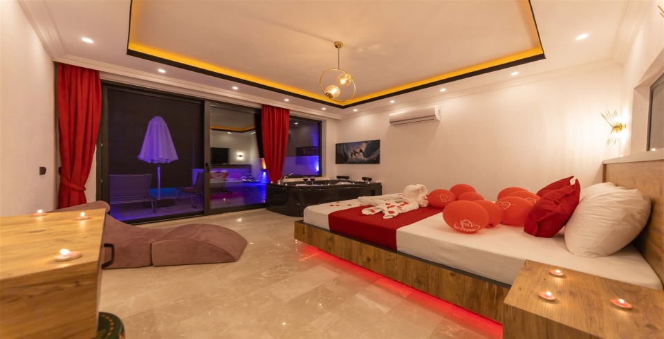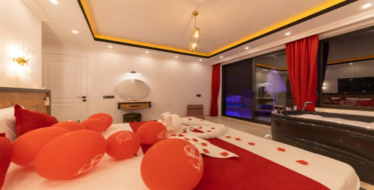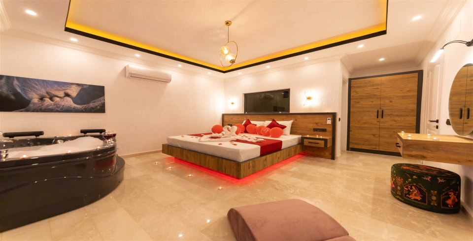 Yatak Odası : Çift kişilik yatak, komodin ,klima, makyaj masası, elbise dolabı, jakuzi, banyo ve tuvalet bulunmaktadır.