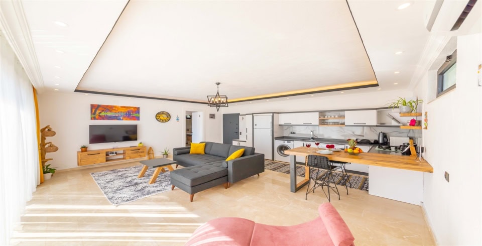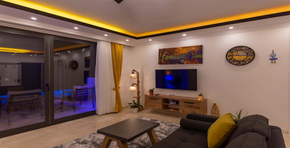 Salon : Oturma grubu, TV, sehpa, Klima, internet.
