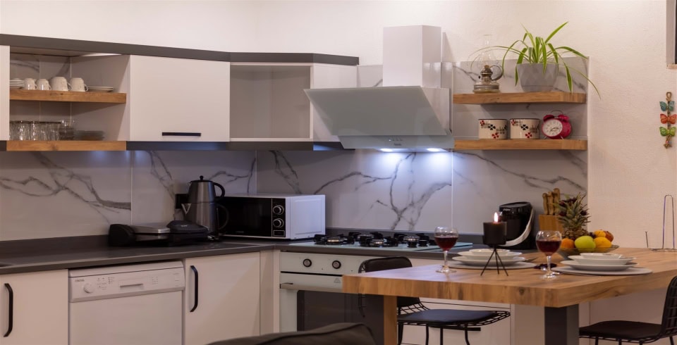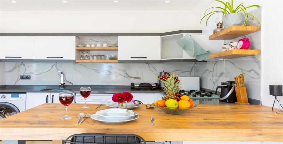 Mutfak : Buzdolabı, çamaşır makinası, bulaşık makinası, 4 lü ocak ,mikrodalga fırın, kettle, çatal bıçak takımı, yemek takımı, fırın bulunmaktadır.