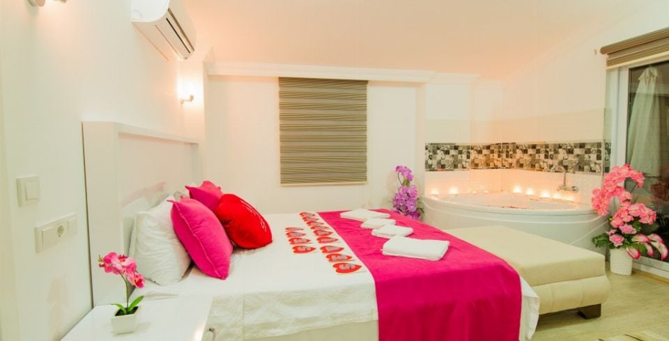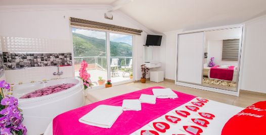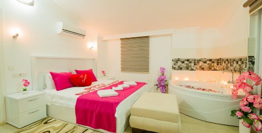1. Yatak Odası : Süit yatak odası çift kişilik konfor yatak, jakuzi, tv, klima, gardırop, komodin, ve banyo-WC yer almaktadır.
