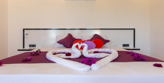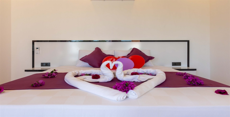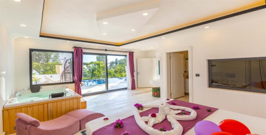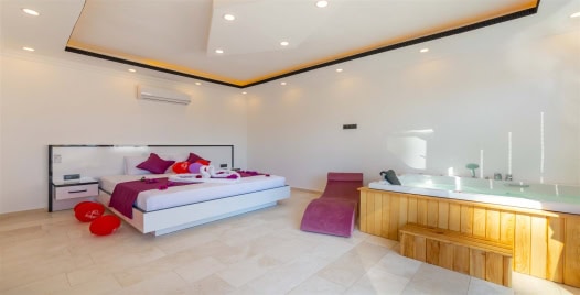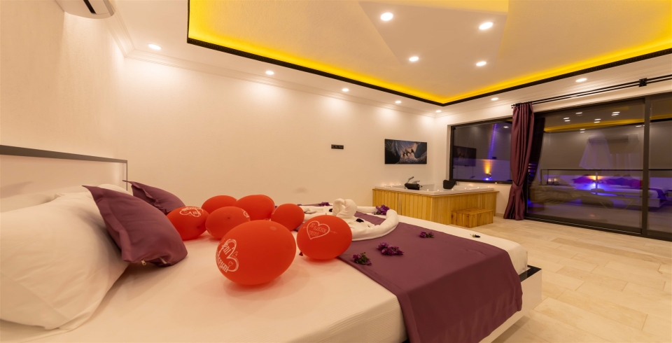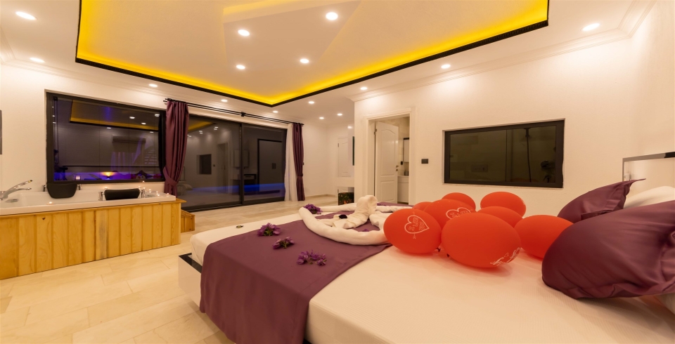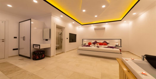 Yatak Odası : Çift kişilik yatak, komodin ,klima, makyaj masası, elbise dolabı, jakuzi, banyo ve tuvalet bulunmaktadır.
