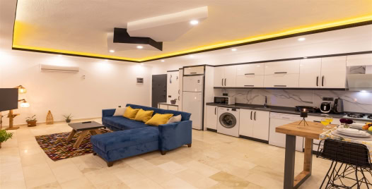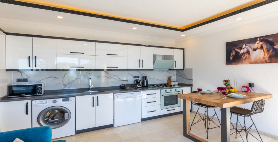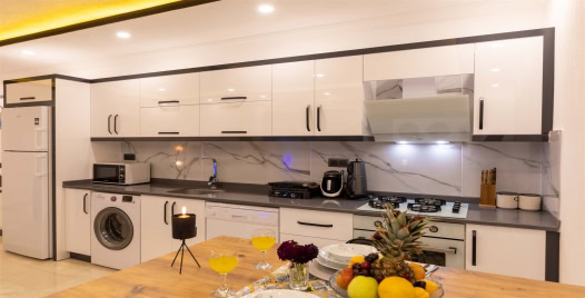 Mutfak : Buzdolabı, çamaşır makinası, bulaşık makinası, 4 lü ocak ,mikrodalga fırın, kettle, çatal bıçak takımı, yemek takımı, fırın bulunmaktadır.